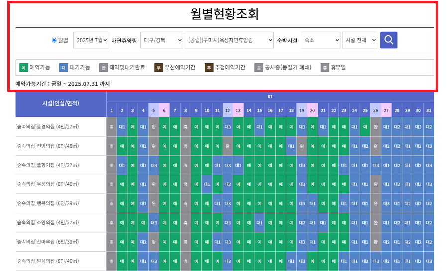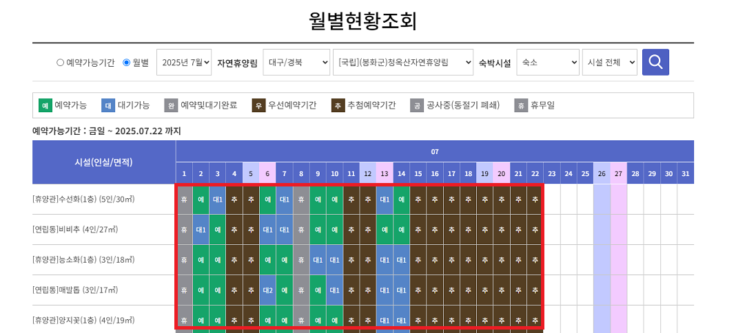 다만, 다음 달 7월로 일정을 잡고 검색을 눌렀을 때 예약 및 대기만 보이는 것이 아니라 '추'라고 되어있다면 성수기 추첨제로 운영되는 국립자연휴양림입니다