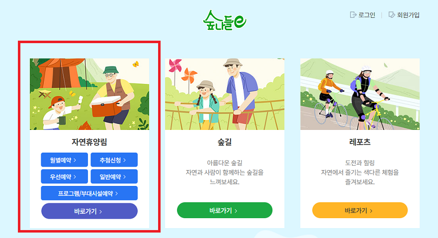 국립자연휴양림을 예약하기 위해서는 숲나들e 홈페이지에서 예약이 가능하며, 한 달 전에 미리 예약해야 다음 달에 국립자연휴양림을 갈 수 있기 때문에 일정을 미리 예약하셔야 합니다