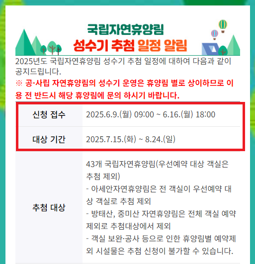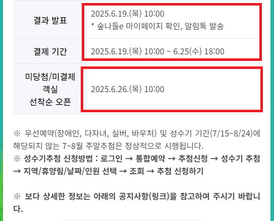 - 성수기 추첨제 기간 : 25년 7월 15일 ~ 8월 24일