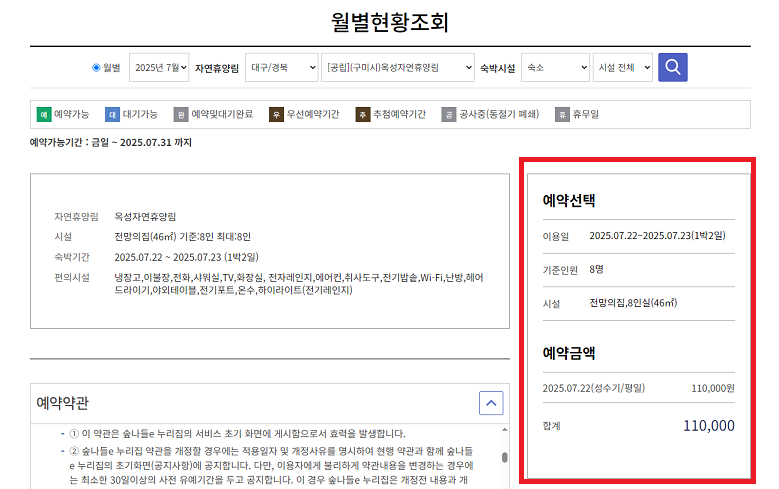 - 우선 예약 대상 여부인지 확인해 보시면 좋습니다(우선 예약 대상은 장애인, 국가유공자, 다자녀, 아세안, 실버전용, 산림복지바우처, 지역주민입니다)