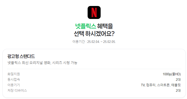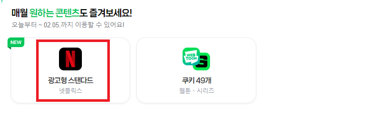4️⃣ 넷플릭스를 선택하면 광고형 스탠더드 요금제를 1달간 무료로 이용할 수 있습니다.