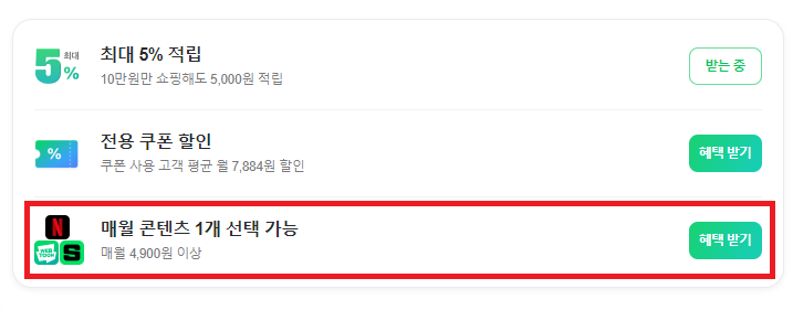 3️⃣ 1달 무료체험하기를 신청하면 매월 콘텐츠 1개 선택하기에서 혜택 받기를 선택합니다.