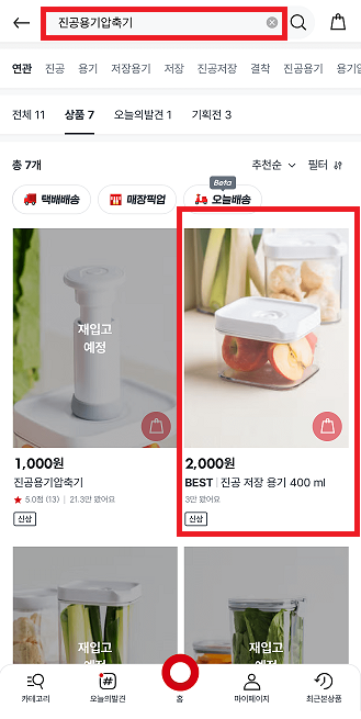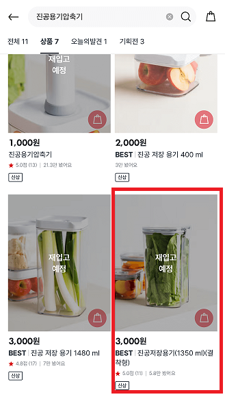 - 상단 검색창에 원하는 상품을 검색합니다(예: 진공압축용기)