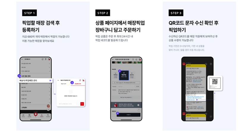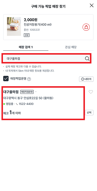 - 상품 상세 페이지에서 배송방법을 매장픽업으로 선택