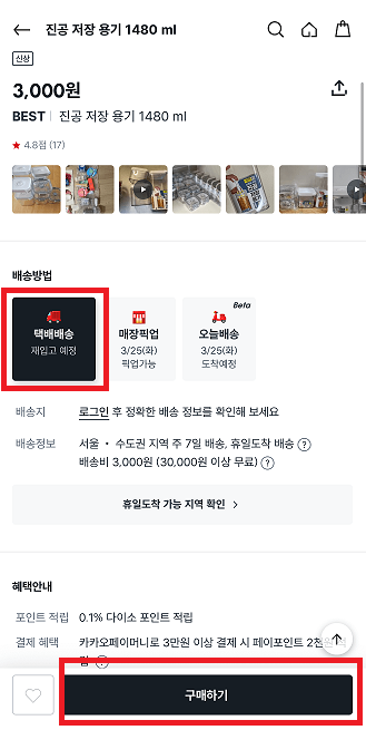 - 배송방법 중 택배배송을 선택하고 구매하기 버튼을 누릅니다