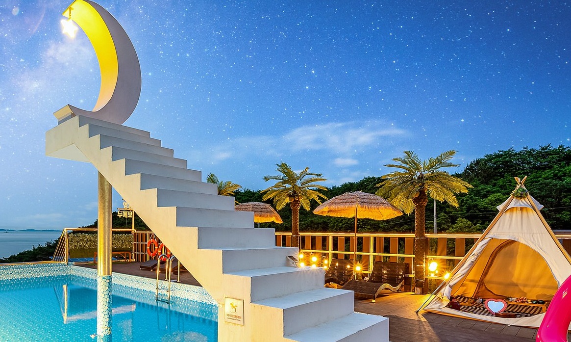 펜션 내에는 수영장과 하늘계단이 있어 연인 또는 가족과 사진을 찍을 수 있고, 실내 온수수영장도 운영하고 있습니다.