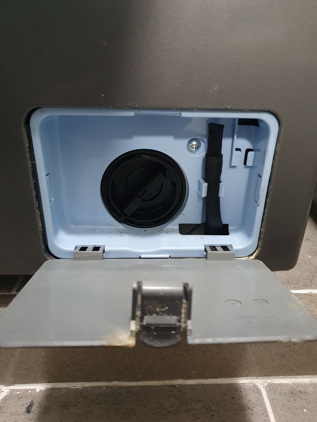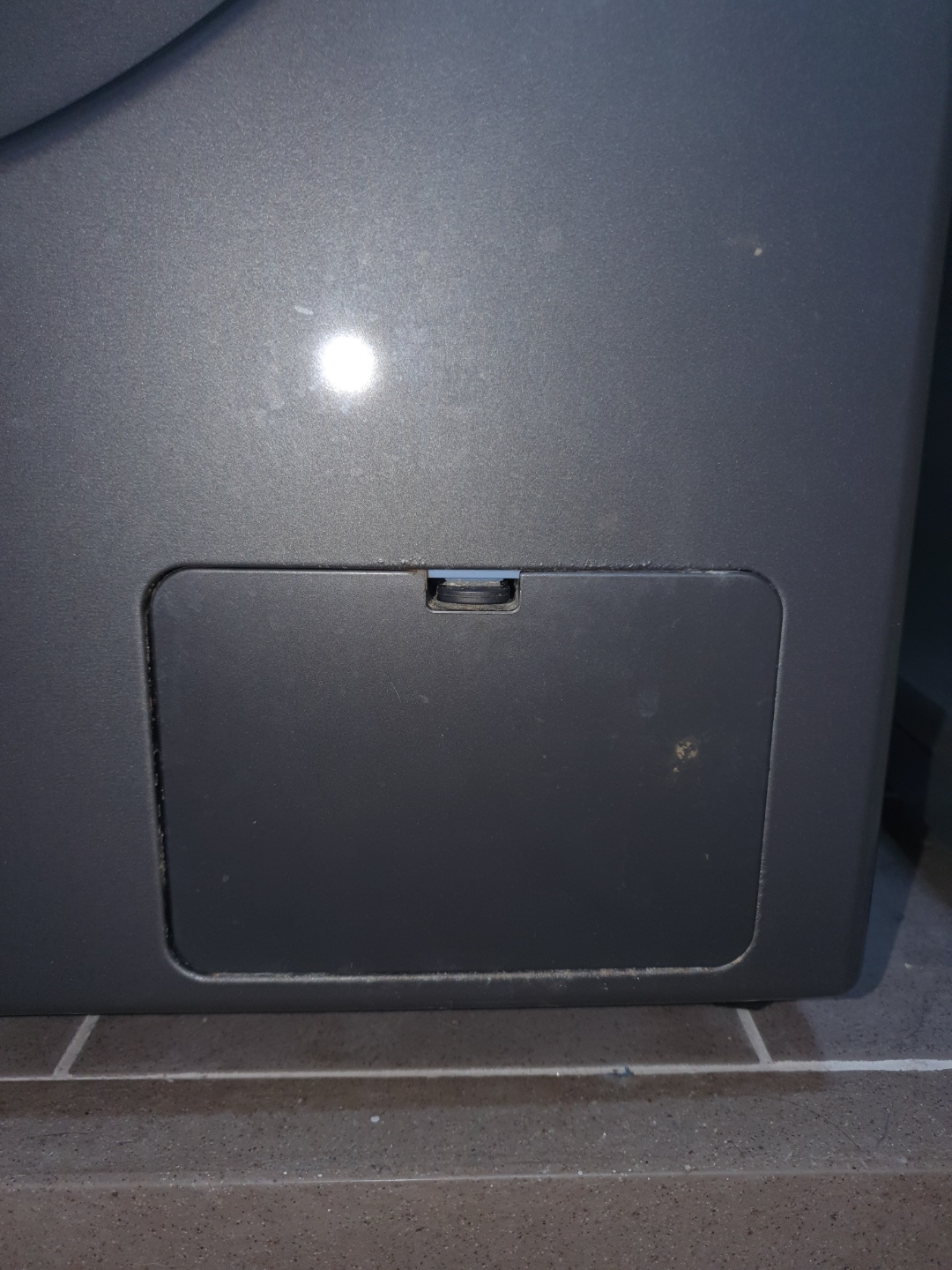 세탁기 하단의 배수 필터 커버가 있습니다. 검은 필터를 돌려서 빼내면 고여있던 물과 필터에 묻어있던 먼지를 제거할 수 있습니다. 필터에 묻은 먼지는 칫솔이나 솔로 닦아주시면 됩니다. 청소 후 배수 필터를 닫아주시면 됩니다.
