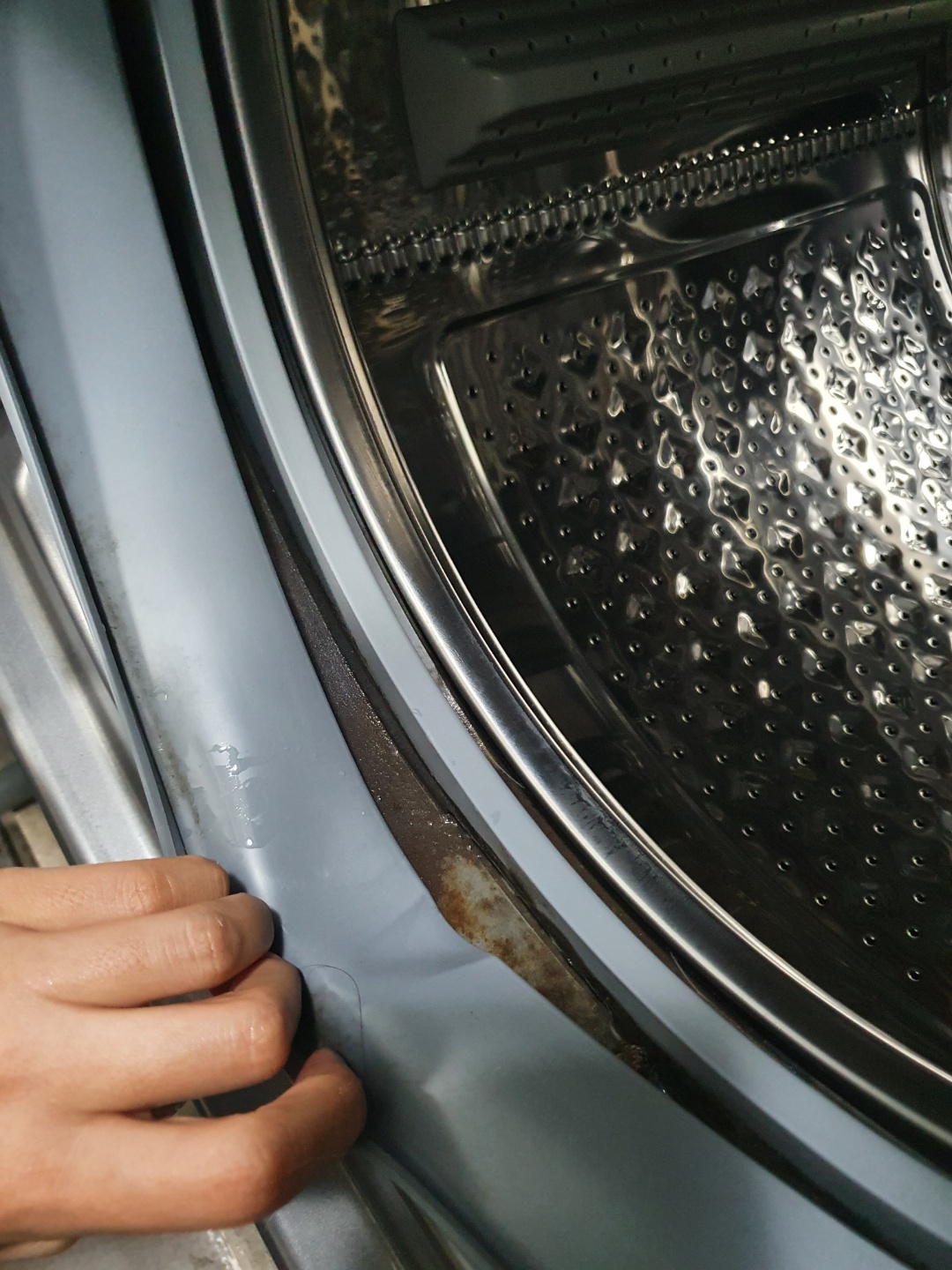 이 고무패킹에는 머리카락이나 보풀 등 이물질이 끼고 싶고, 곰팡이 역시 제일 잘 생기는 곳입니다. 여기 청소법에 세척 솔로 닦아 내시거나 간단하게는 물에 락스를 풀어 물티슈에 묻혀서 패킹 안에 끼어넣는 방법이 있습니다. 뒤의 방법으로 청소하시려면 락스로 인하여 창문을 열어놓고 진행하셔야 합니다.