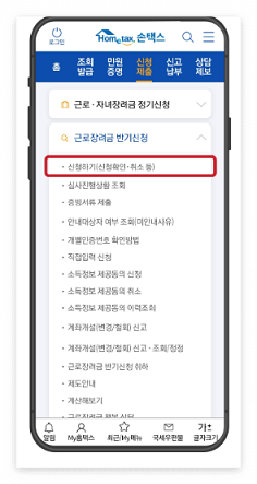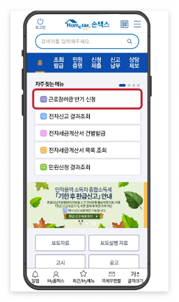 - 홈택스에 접속하여 홈메뉴에서 근로장려금 반기 신청을 선택 후 신청하기를 누릅니다.