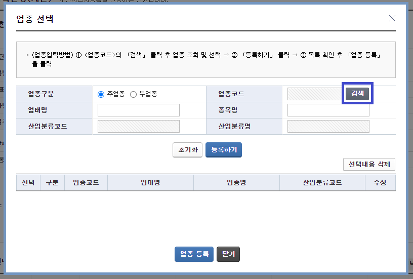 △ 업종 입력/선택을 누르면 업종 선택 화면이 뜨고 업종코드 옆의 검색을 클릭합니다. 그리고 사업자등록증 발급을 받으려는 업종코드를 기입해주셔야 합니다.(업종코드는 아래 엑셀 파일을 참조해주시면 됩니다)