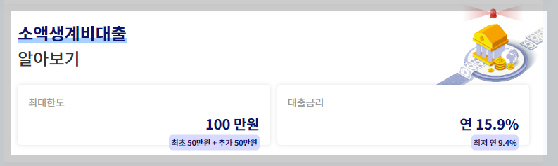 소액생계비대출은 최대 100만 원까지 지원되며, 최초 이용 시에는 최소 50만 원 대출이 가능하며 6개월간 정상이용 시 추가대출 1회 가능하여 총 100만 원이 대출됩니다.