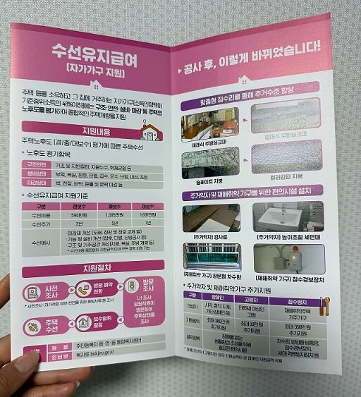수선유지급여는 주택을 소유하고 있는 그 집에 거주하는 자가가구의 구조나 안전, 설비, 마감 등의 주택의 노후도를 평가하여 수리해야 된다는 조사가 결정되면 수리비를 지원해 주는 제도입니다