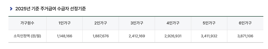 | 소득인정액(월) | 1,148,166 | 1,887,676 | 2,412,169 | 2,926,931 | 3,411,932 | 3,871,106 |