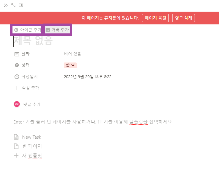 ▶새로운 페이지를 작성할 때 상단에 아이콘 추가와 커버를 추가할 수 있습니다. 오른쪽 사진과 같이 이쁜 커버를 추가하여 내가 원하는 대로 이쁘게 꾸밀 수 있습니다.