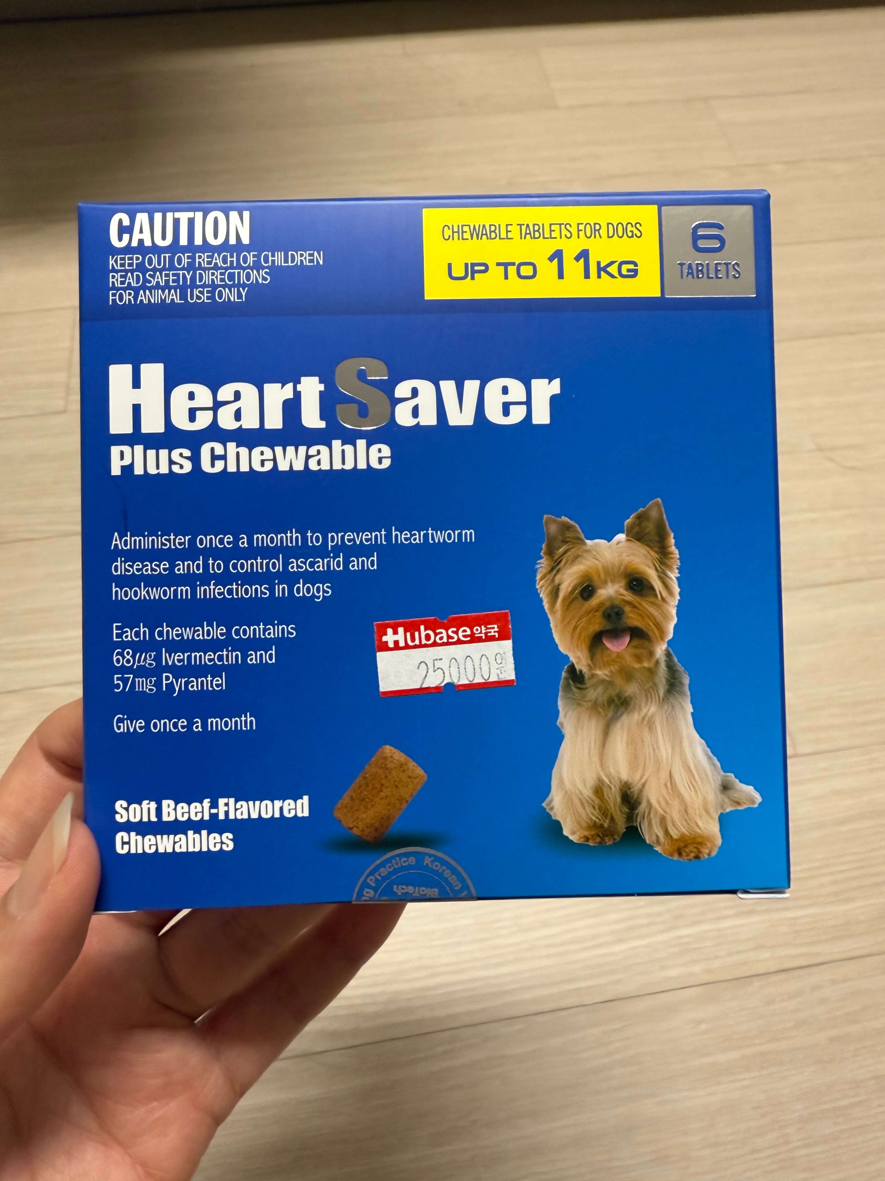 제가 먹이고 있는 심장사상충약은 하트세이버 제품으로 약은 6정이 들어가 있으며, 몸무게 11kg 이하 강아지의 경우 가격은 25,000원입니다(약의 가격은 약국마다 다를 수 있습니다)