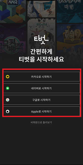 - 티벗 앱 설치 후 카카오, 네이버, 구글, APPLE 중 선택하여 회원가입을 진행합니다
