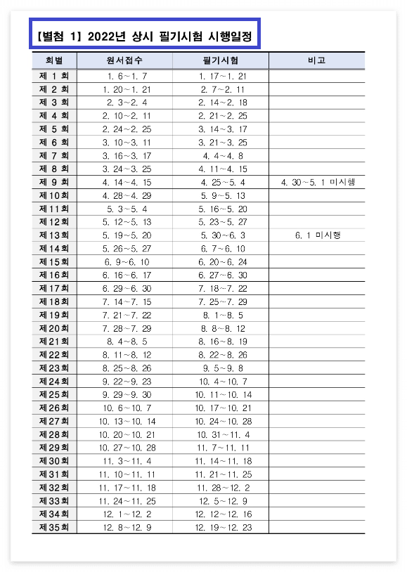 ▲위는 2022년 상시 필기시험과 실기시험 일정입니다.