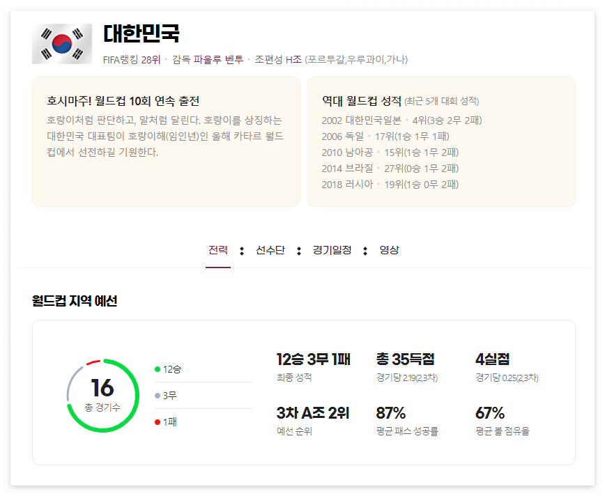 - 우리나라의 16강 진출 전략으로는 우루과이와의 경기에서 무승부 이상을 목표로 하고 있습니다.
