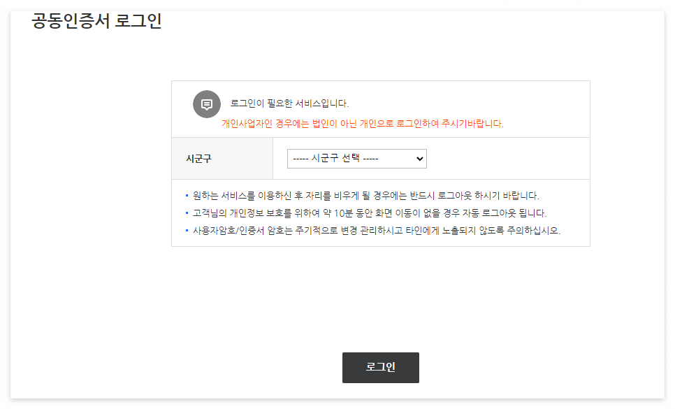 3. 신청하려는 지역과 나의 정보를 입력 후 공동 인증서를 통하여 로그인합니다.