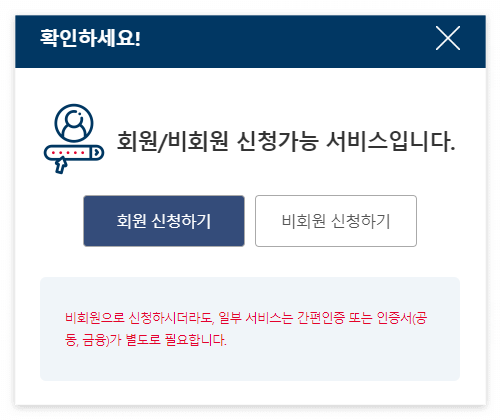 3. 회원 신청과 비회원 신청 선택창이 나오는데, 회원 신청으로 신청하시는 것이 좋습니다. (정부24의 홈페이지는 여러 민원서류를 출력하는데 많이 이용하는 정부기관 홈페이지이니, 회원 가입해두시는 것이 좋습니다)