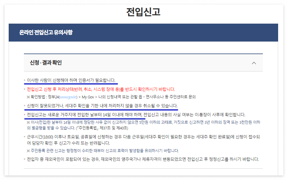 기존 거주지에서 새로운 거주지로 전입한 경우 14일 이내에 신고를 하여야 합니다. 전입신고를 하지 않을 경우 5만 원 이하의 과태료가 발생하며, 거짓으로 전입신고할 경우 3년 이하의 징역 또는 3천만 원 이하의 벌금형이 있으니 전입신고를 이사하신 후 바로바로 해주시는 것이 좋습니다.