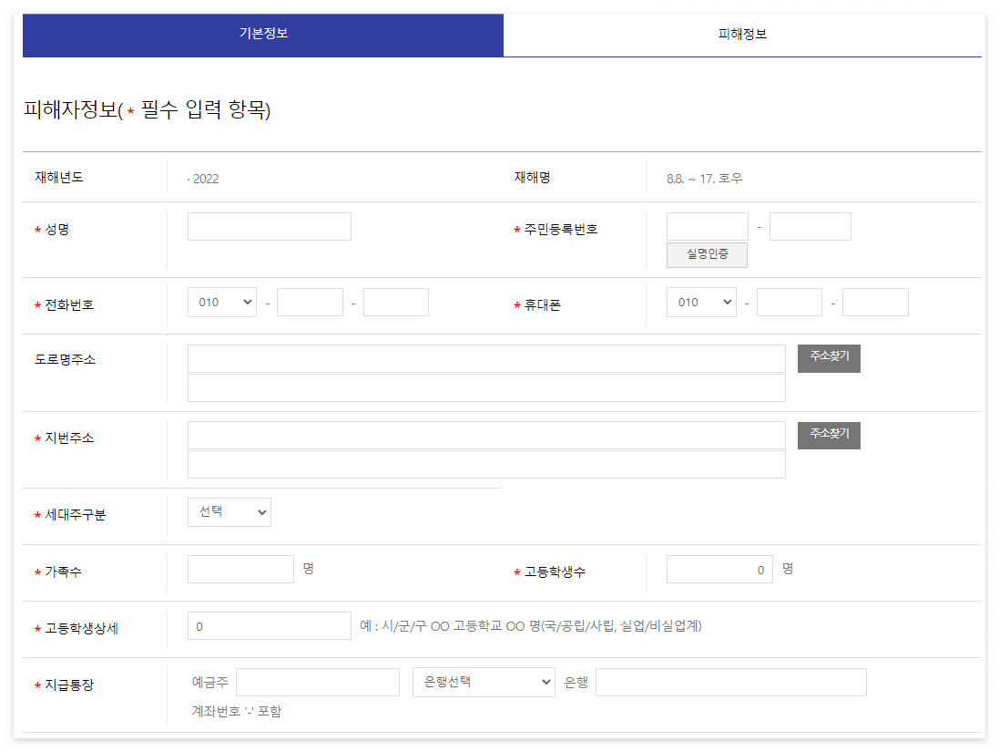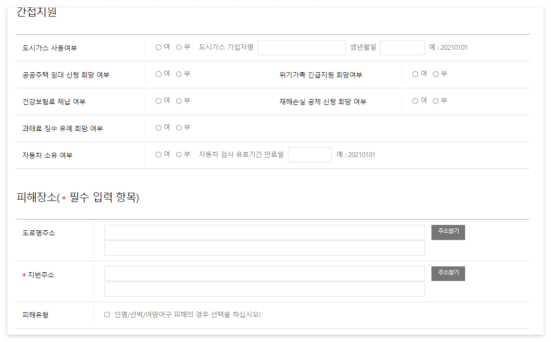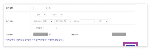 피해 장소에 대하여 기입해주시면 됩니다. 위 사진 중 피해 종류에는 주택을 선택해 주시면 됩니다. 피해의 종류에서 전파/유실, 반파는 주거의 형태가 소유주일 경우가 선택 가능합니다. 세입자의 경우는 침수주택수리비를 선택하시면 됩니다.