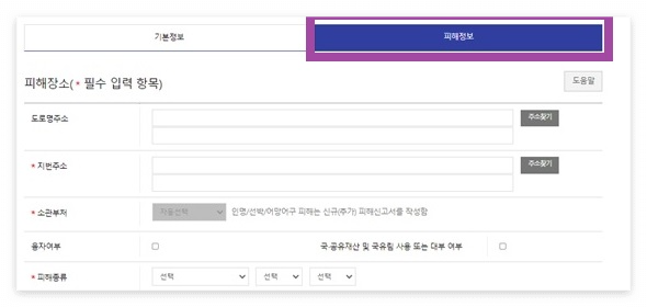 간접지원란에서 여는 YES의 의미이고, 부는 NO의 의미입니다. 상황에 맞게 체크해주시면 됩니다. 피해 장소란에는 피해를 입은 주소를 기입해 주시면 됩니다. 아래의 신고자 정보까지 다 기입하시고 맨 하단에 다음을 클릭하시면 피해정보에 대해서 기입할 수 있습니다.