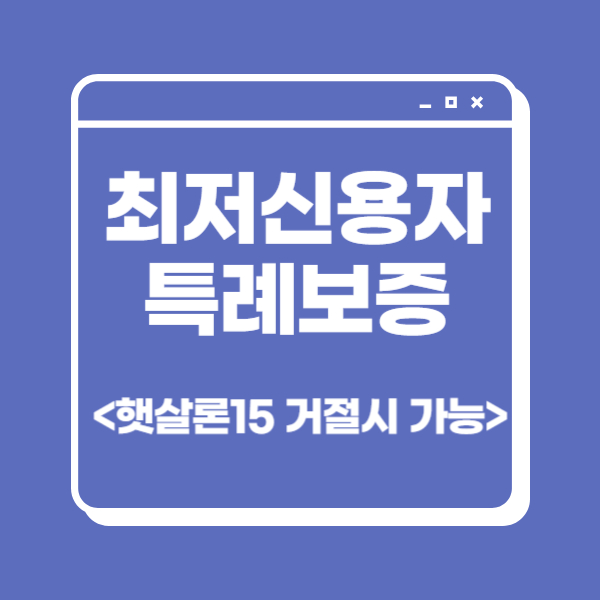 돈이 필요하여 햇살론 15 대출을 신청하여 연체경험이나 다른 사유로 대출승인이 거절되었을 때 어려움을 겪고 계신 분들에게 최저신용자 특례보증 대출정보에 대하여 알려드리겠습니다. 최저신용자 특례보증 대출은 햇살론 15보다 더 낮은 신용평점을 가진 분들에게 적합한 상품이니 자세한 내용 확인하시고 신청해 보시기 바라겠습니다.