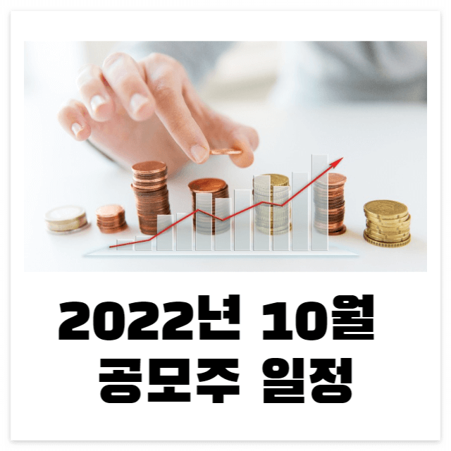 요즘 고금리로 인하여 주식시장과 부동산 시장이 하락세입니다. 투자가 어려운 시기라 공모주 시장도 흥행하지는 않지만 기관 수요예측에서 경쟁률이 높게 나오고 미래에 유망한 업종이라면 공모주 하시는 것을 추천드립니다. 커피값이나 치킨값이라도 벌어갈 수 있다면 좋지 않을까요? 오늘은 2022년 10월 공모주 일정에 대하여 알아보겠습니다.