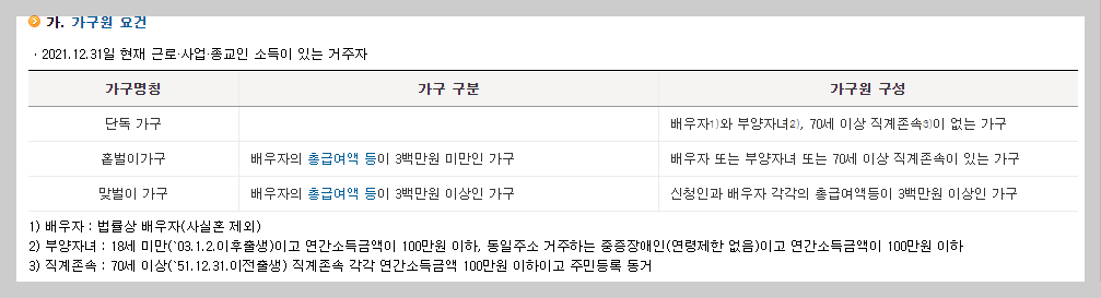 2. 소득 요건에서는 가구원 구성 유형에 따라 총소득기준금액 미만일 경우 신청자격이 됩니다.