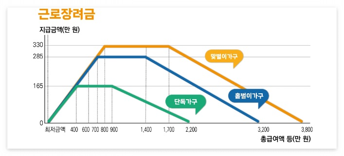 단독가구의 경우 최대 165만 원, 홑벌이가구의 경우 최대 285만 원, 맞벌이가구의 경우 최대 330만 원으로, 작년 일을 쉬었거나 일을 하여도 일시적으로 한 경우, 소득이 적은 경우 근로장려금 지급을 받을 수 있습니다.