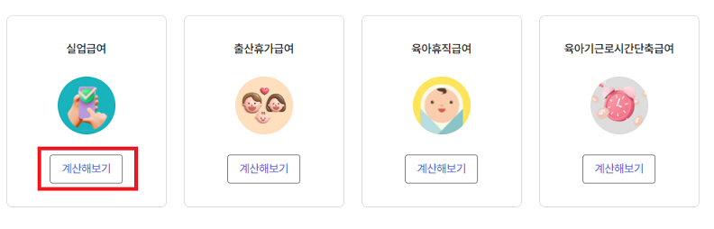 👉위의 실업급여 모의계산하기를 선택하시면 지원금을 모의계산할 수 있는 화면이 나타나며 실업급여를 선택합니다