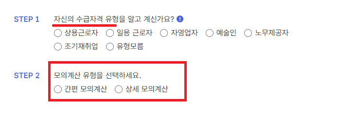 👉 여러분의 수급자격 유형과 모의계산 유형을 선택합니다. 저는 상용근로자로 간편 모의계산해 보겠습니다
