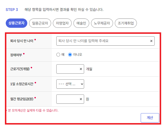👉 수급자격 유형과 모의계산 유형을 선택하면 계산기가 나타나며, 근로기간과 근로시간, 평균임금 등을 기입합니다
