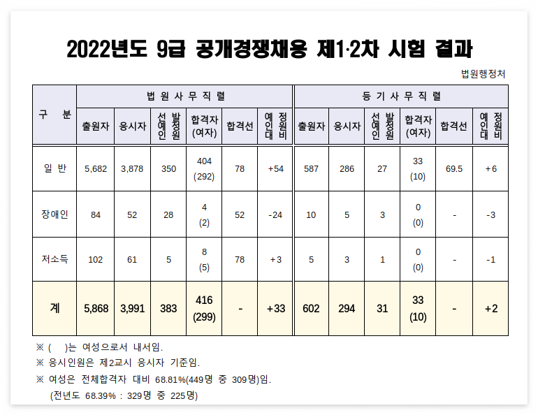 → 법원 사무직 일반 경쟁률은 16.23 : 1 / 장애인 경쟁률은 3 : 1 / 저소득 경쟁률 20.40 :1 / 총경쟁률은 15.32 : 1