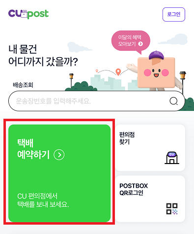 1️⃣ CU 편의점택배 어플을 다운로드 후 메인 화면의 택배 예약하기를 선택합니다