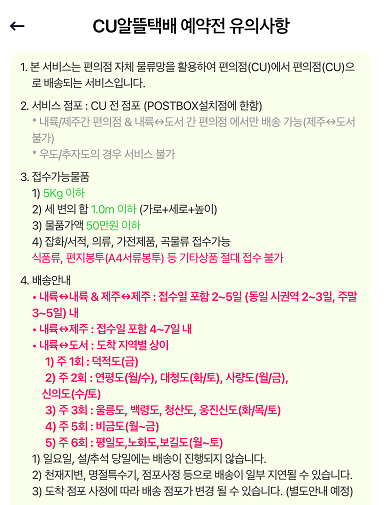 2️⃣ CU 알뜰택배(반값택배)를 사전 예약하기 전 유의사항을 확인하셔야 하며, 접수 제한 품목을 꼭 확인하시는 것을 권장드립니다