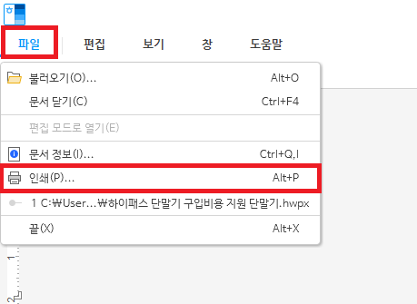 - 상단의 파일탭에서 인쇄를 누릅니다